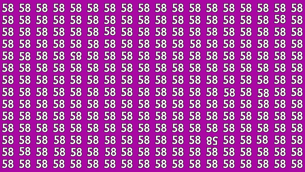It is a field of repeating 58s that you are provided with in this optical illusion. There are a couple of devious trespassers within it, one 85 and the other 58 inverted. You have to do it in less than 8 seconds. It is even more challenging by the short time time constraint since your brain does not have the time to slow down and look at each figure digit by digit. You are forced to survive by using quick scan images, recognition, and attention. It is a real ordeal of mental quickness and visual precision.